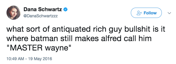 “What sort of antiquated rich guy bullshit is it where Batman still makes Alfred call him MASTER Wayne?”