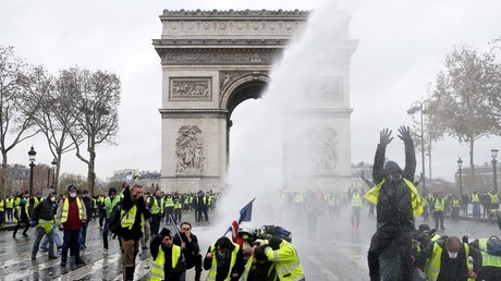 A standoff at the Arc de Triomphe led some to draw parallels between the Yellow Vest protests and France’s revolutionary past. Footage of the encounter between protesters and riot police near the iconic monument shows a man kneeling in front of the arch, with his hands stretched out.